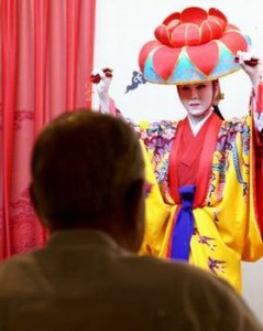 SONY DSC琉球舞踊の一つ「護身舞踊」は元来、武器を持たずに生活していた琉球の人々が身を守るために身につけていた空手などの動きを取り入れたもの。演者の方に「あなたは相当の段を持ってるでしょう」と尋ねる李氏。関係者によると、日本でも有数の舞手の方とのこと。