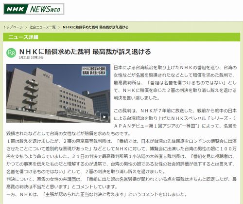 1月21日午後3時、平成21年(2009年)6月25日の提訴から約6年半を経て、NHK「JAPANデビュー」裁判における最高裁判所の判決が下された。