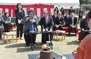 この日は、松本城本丸庭園で歓迎の茶席が催され、陳菊(ちんきく)・高雄市長や菅谷昭・松本市長ら関係者約40人が出席した。