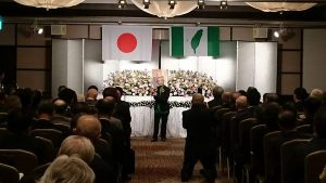 また、森敬恵さん(ソプラノ歌手)の指揮により「仰げば尊し」を全員で斉唱、最後に国家基本問題研究所副理事長、日本会議会長、日本李登輝友の会副会長を兼任する田久保忠衛・杏林大学名誉教授が閉会の辞を述べ、2時間にわたった第1部「偲ぶ会」は慎ましやかな中にも笑いや涙をさそう場面をまじえながら閉会となりました。