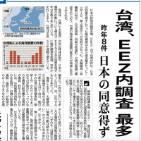 産経報道「台湾、同意得ず日本のEEZ内調査 昨年最多の8件」